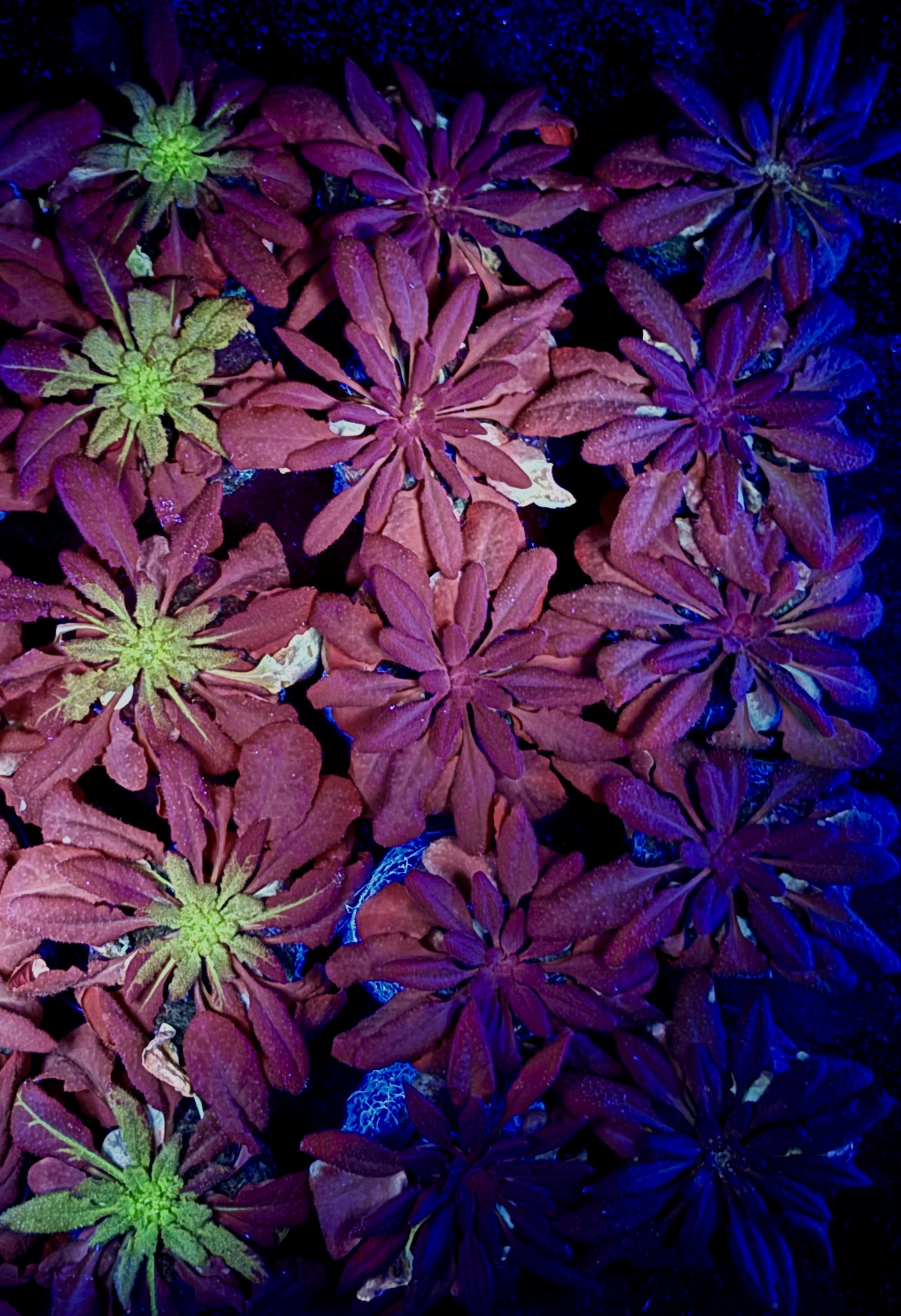 Images: Arabidopsis control plants and plants expressing Rysto or an inactive Rysto variant infected with a fluorescently-labeled TuMV virus (an infectious clone used for visualizing viral movements). Plants were grown at elevated temperatures, and virus spread was observed by green fluorescence fourteen (14) days after infection.